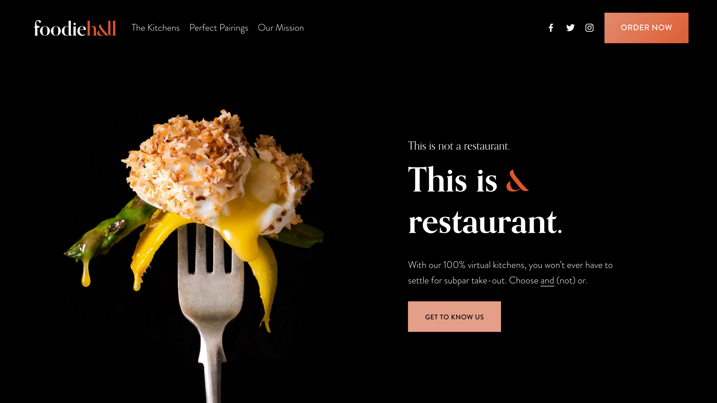 Foodiehall is the next generation of take-out, giving you options like no other in just one easy order. As a Ghost Kitchen, the newest evolution of take-out, it was important that the brand communicate its endless options and hands-off, virtual availability. I led execution of overall look and feel, creative strategy, branding, and web, for a result that is memorable and timeless.